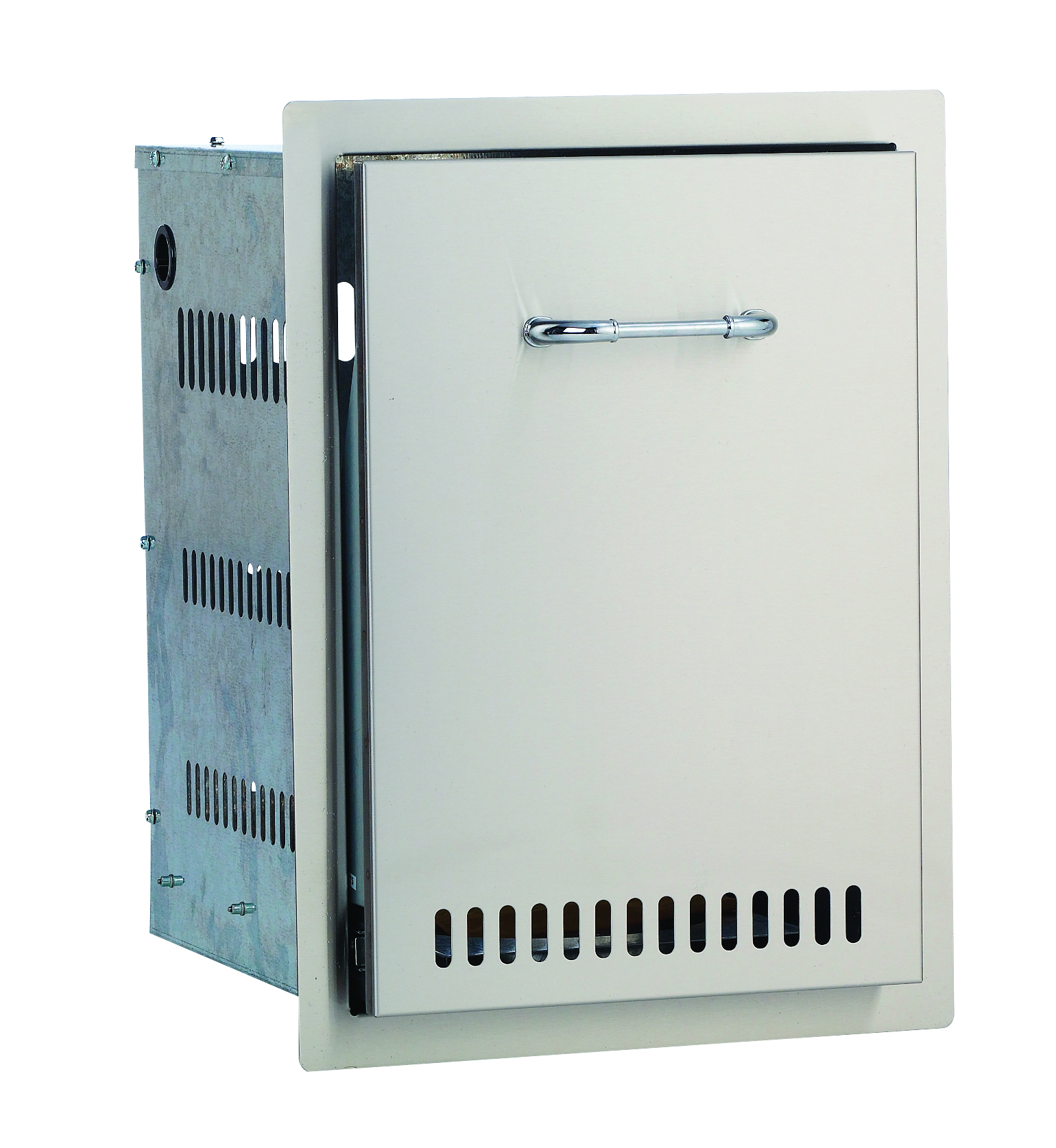 This drawer is constructed from durable 304 stainless steel to ensure it withstands the elements and perfectly matches your other Bull outdoor components. The full-extension drawer slides out completely, revealing a secure base designed to hold a standard 20 lb propane tank. Integrated side vents provide the necessary airflow required for safely enclosing a propane tank. For installation, the required island cut-out dimensions are 14 ⅝” in width, 19 ¾” in height, and 16 ½” in depth.