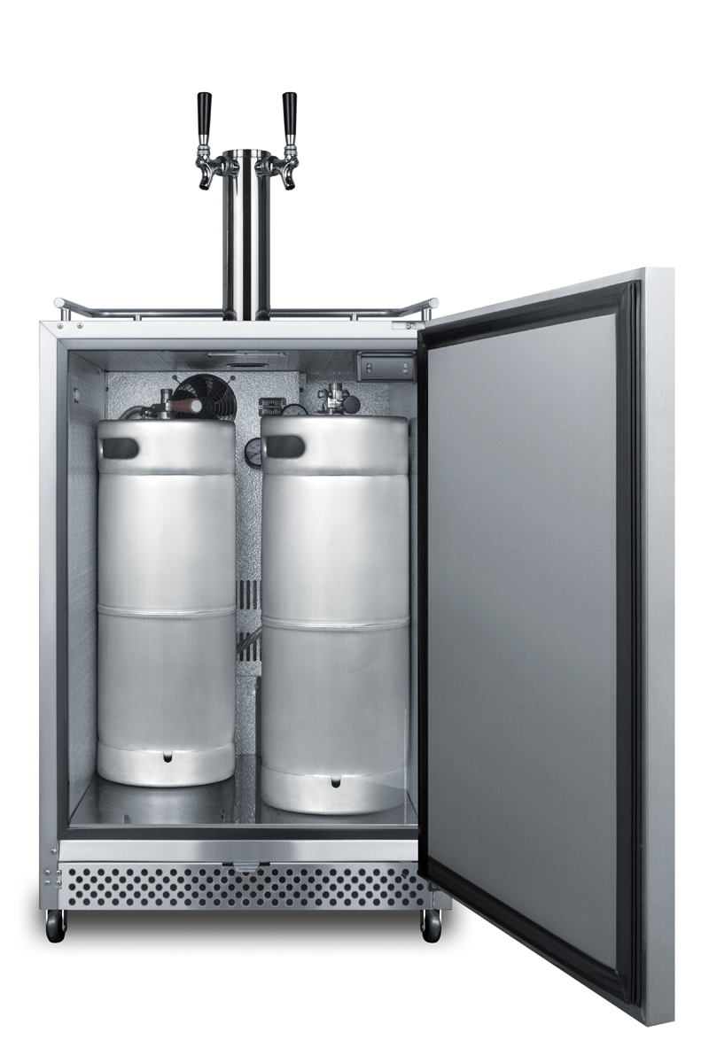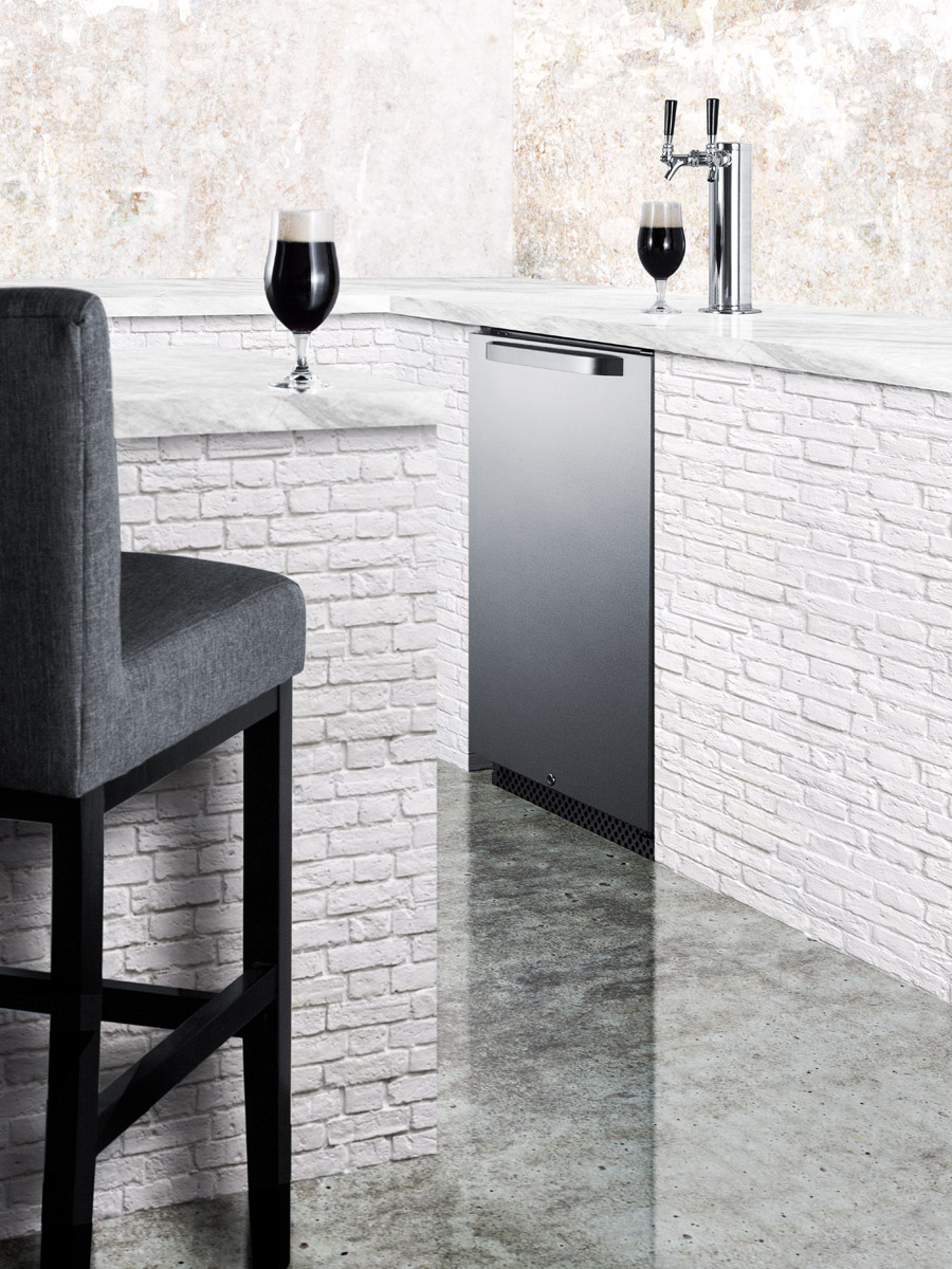 This kegerator is built to perform in any outdoor setting, featuring a durable stainless steel construction and a front-venting design for seamless built-in applications. Its spacious interior can hold one half-barrel keg or two smaller sixth-barrel kegs, giving you ultimate flexibility. It comes equipped with a complete twin tap dispensary system. For installation, the unit’s dimensions are 34 ⅜” in height, 23 ⅝” in width, and 24 ⅛” in depth.